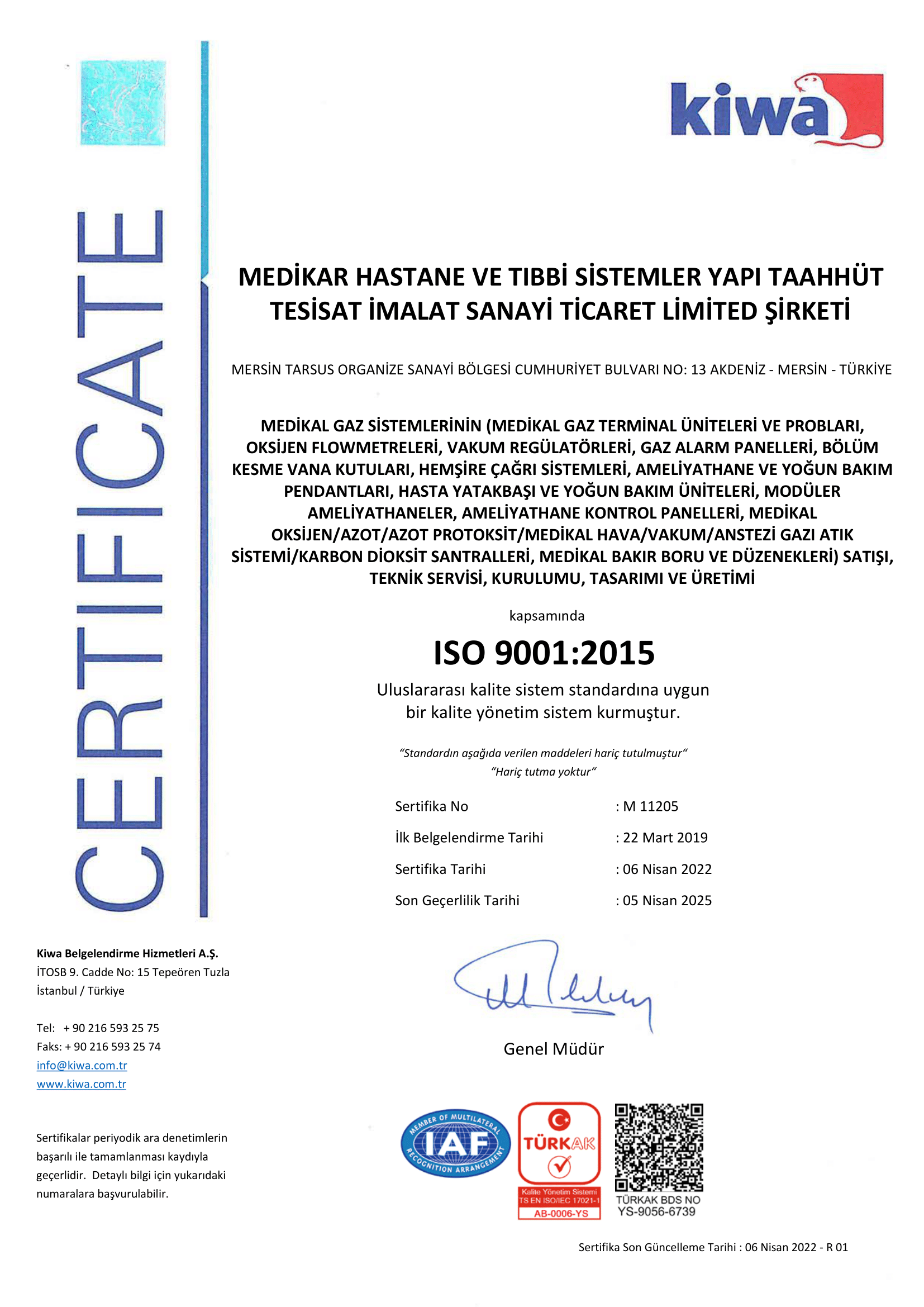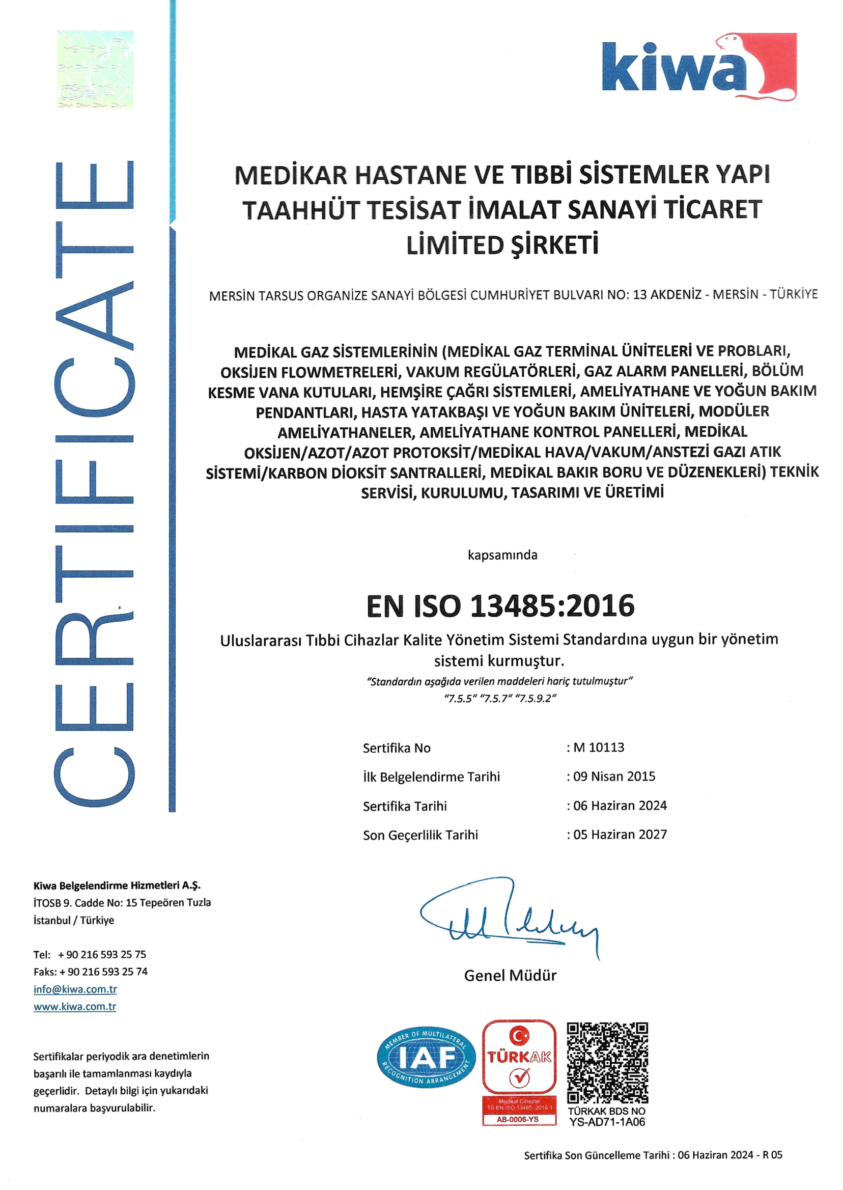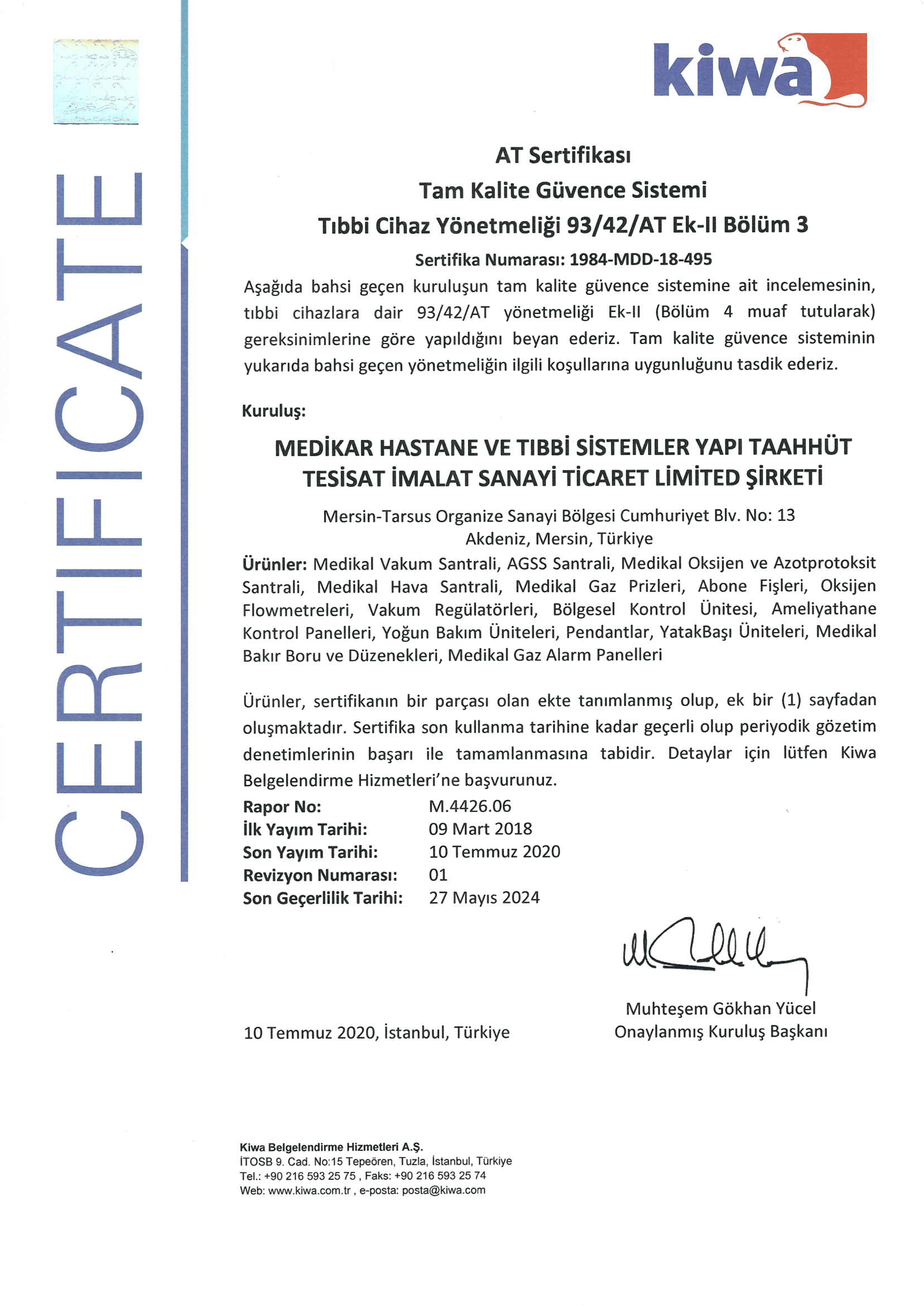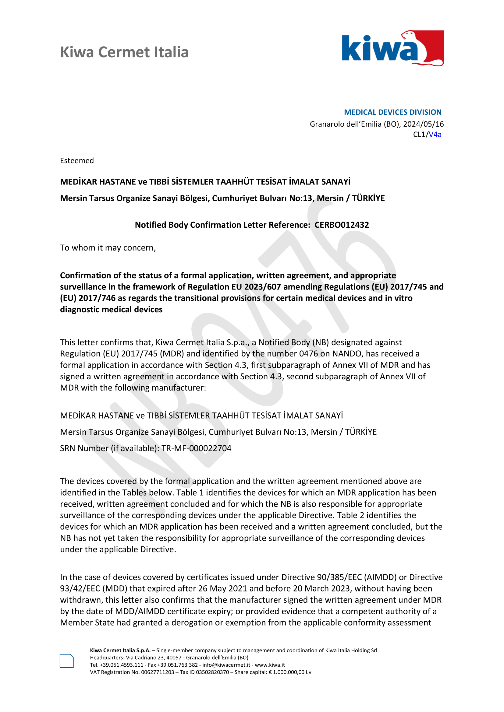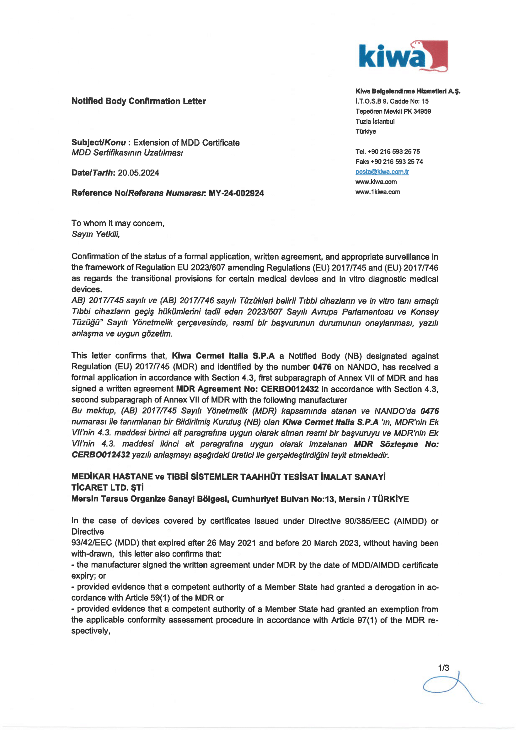 ✯ Medikar’ın sahip olduğu MDD/93/42 sertifikasının 27 Mayıs 2024 tarihinde geçerliliğini yitirmesi nedeniyle, Medikar, Avrupa Birliği’nin tıbbi cihazlara yönelik yeni yönetmeliklerine uyum sağlamak amacıyla MDD’den MDR’a geçiş sürecine başlamıştır. Bu kapsamda, Kiwa İtalya ile yeni bir sözleşme yapılmış ve CE sertifikası uzatma talebi doğrultusunda Extension Letter(Onay Mektubu) ve Confirmation Letter(Sertifikanın Uzatılması) belgeleri Medikar’a sunulmuştur.